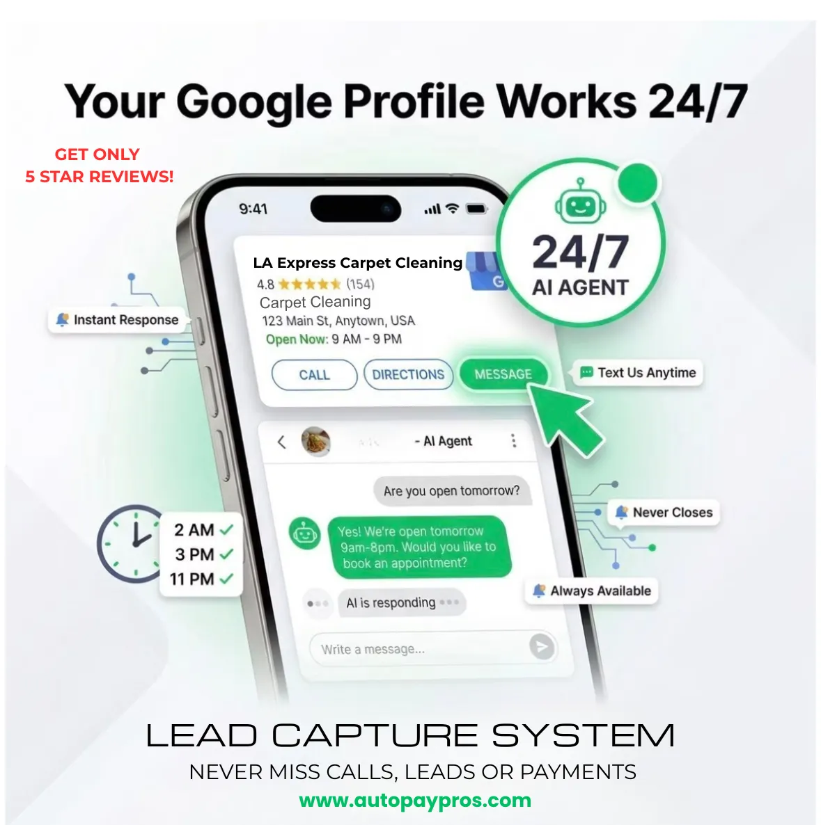 Add 5–10 Extra Jobs Per Month with our 24/7 Lead Capture System. Filters Out Telemarketers and only sends Verified Quality Leads. Includes: Lead Gen Website, Google/Yelp Voice Chat, Missed Call Text Back, Auto Lead Follow Up, Business Smart Phone. Get More 5 Star ⭐⭐⭐⭐⭐ Reviews!